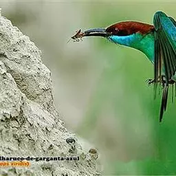 蓝喉蜂虎中型鸟类,体长26~28厘米。头顶至上背栗红色或巧克力色,过眼线黑色,腰和尾蓝色,翼蓝绿色,…