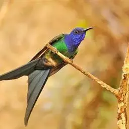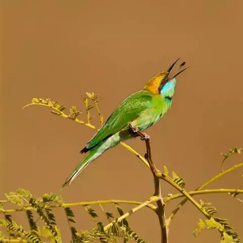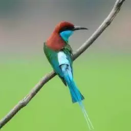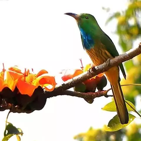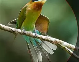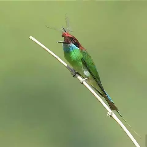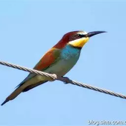 蓝喉蜂是蜂虎科蜂虎属鸟类。体长26-28厘米,嘴长而弯曲,有明显细长的中央尾羽。…