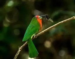 南红蜂虎中等大小,嘴形细长而下弯,先端尖,嘴峰有棱脊;脚细弱,中趾与外趾至少连结至基部第二个关节,…