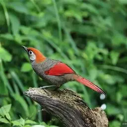 赤尾噪鹛中型鸟类,体长24~28厘米。头顶至后颈红棕色,两翅和尾鲜红色,眼先、眉纹、颊、颏和喉黑色,…