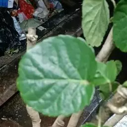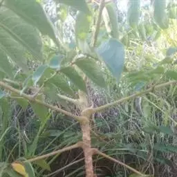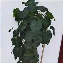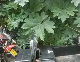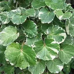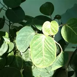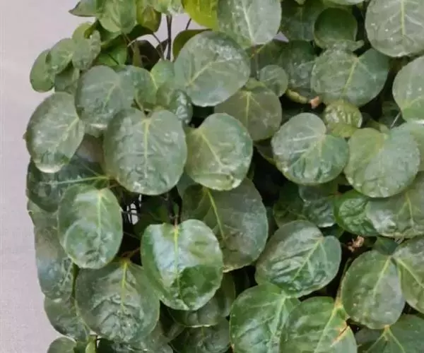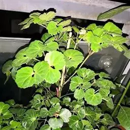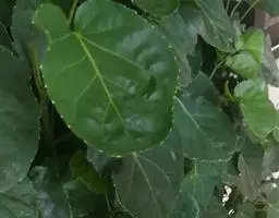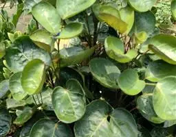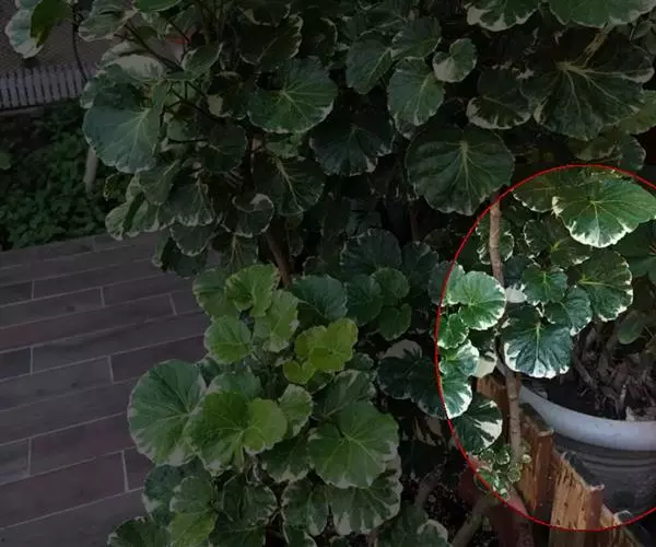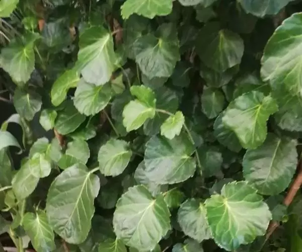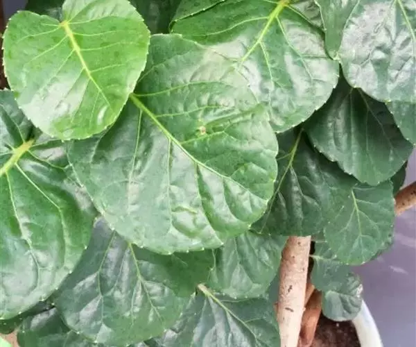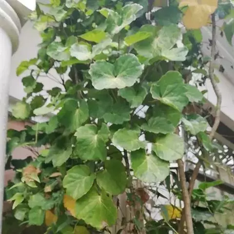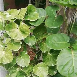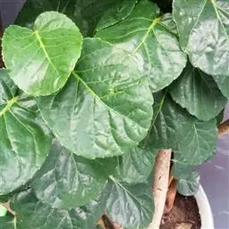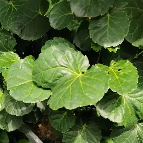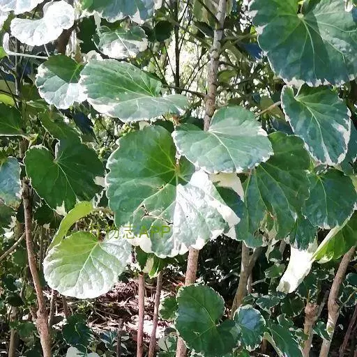 圆叶南洋参 茎带同色,茎枝表面有明显的皮孔。叶为一回羽状复叶,小叶阔圆肾形,直径约为10厘米,叶缘有粗钝锯齿或不故规则浅裂,先端圆,基部歆心形,叶缘稍带白色,薄肉质。