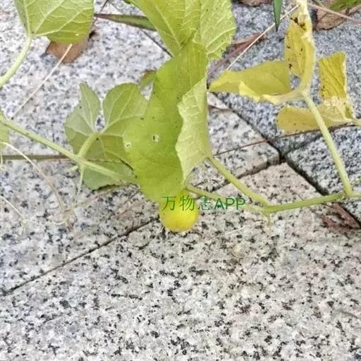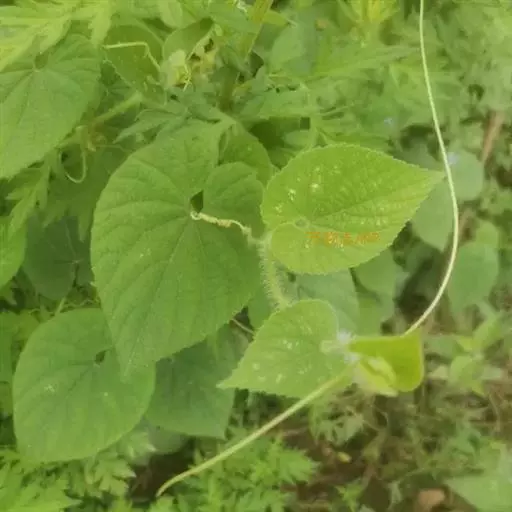 攀援草质藤本,全株被黄白色的长柔毛状硬毛;根块状;茎稍粗壮,有棱沟。叶柄稍粗,长2-6厘米;叶片宽卵状心形,长5-8厘米,宽4-9厘米,边缘浅波状,有大小不等的细齿,先端急尖或短渐尖,基部心形,弯缺深,近圆形或半圆形,深1-1.5厘米,宽1.5-3厘米,两面粗糙,脉上有长硬毛,最基部1对叶脉沿叶基弯缺边缘向外展开。卷须纤细,被长柔毛,单一。