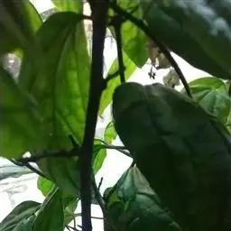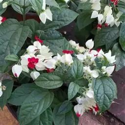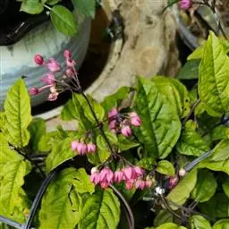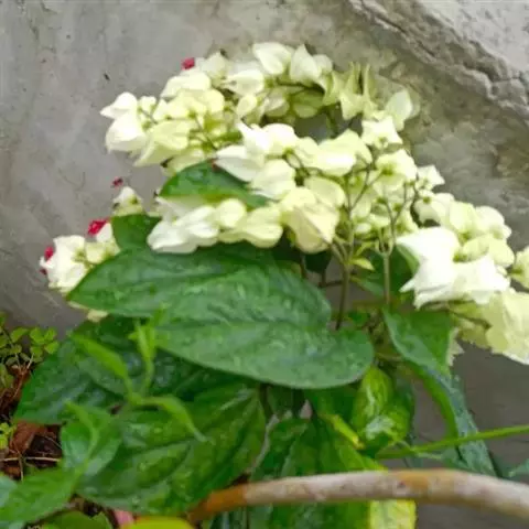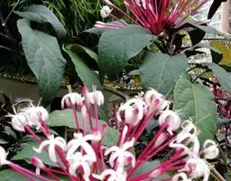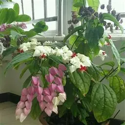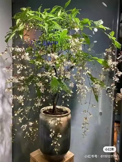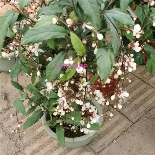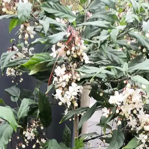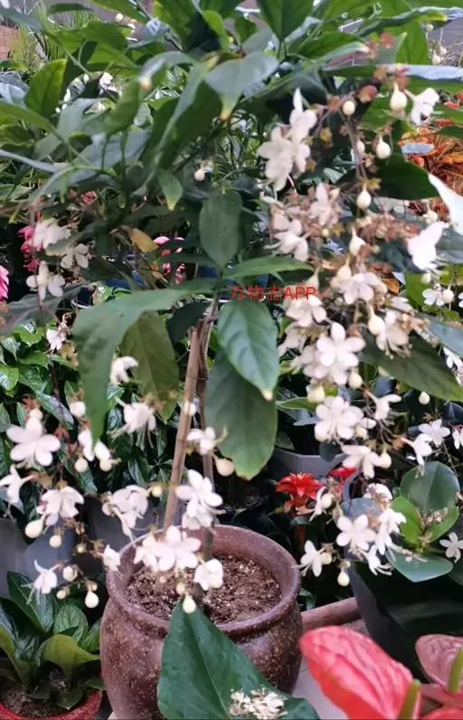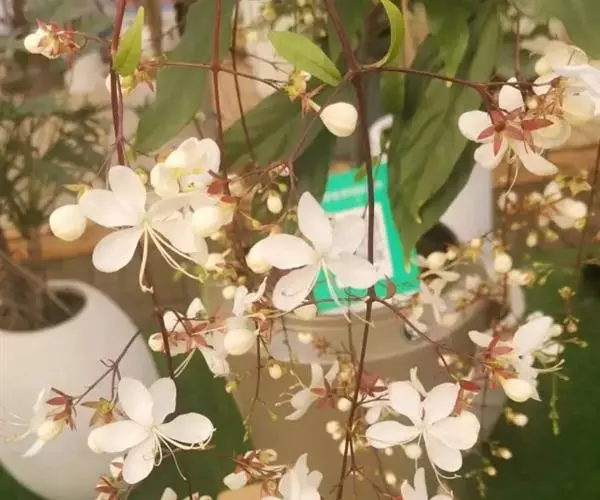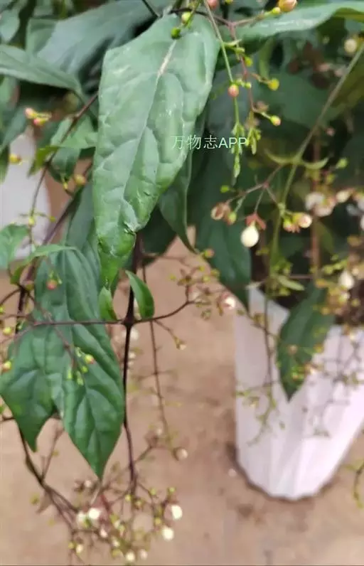 垂茉莉又名垂枝茉莉、黑叶龙吐珠,花朵形似白蝴蝶。枝条纤细,花姿飘逸,盛开时花香扑鼻,果期为春夏之际。果成熟时,花蕚增大增厚,由鲜红色转为紫红色,衬托着小巧玲珑果实。球形核果,初时黄绿色,成熟后光亮紫黑色,倒挂,故有“黑叶龙吐珠”之称。
