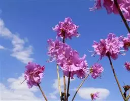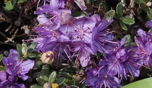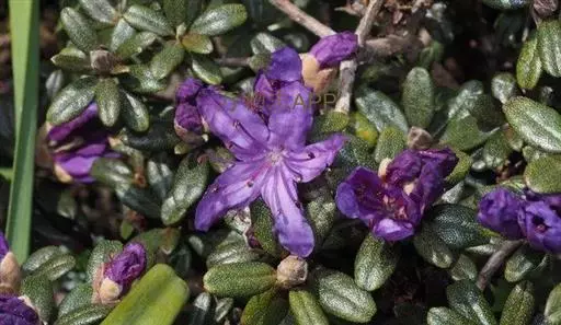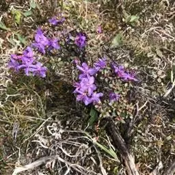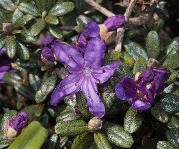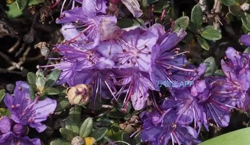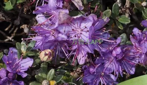 密枝杜鹃(学名:Rhododendron fastigiatum Franch. ):常绿灌木,高0.8-1米,分枝稠密,常成垫状或平卧。幼枝短,带红褐色,被暗褐色鳞片。叶芽鳞早落。叶集生于小枝顶端,革质,长圆形、椭圆形或卵形上面暗绿色,下面灰绿色。花序顶生,伞形总状,有花3-5朵;花冠宽漏斗状,长1-1.5厘米,紫蓝色或鲜淡紫红色。蒴果卵圆形。花期5-6月,果期8-9月。