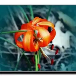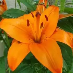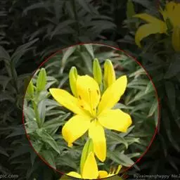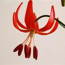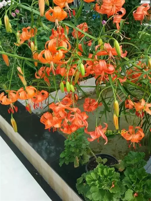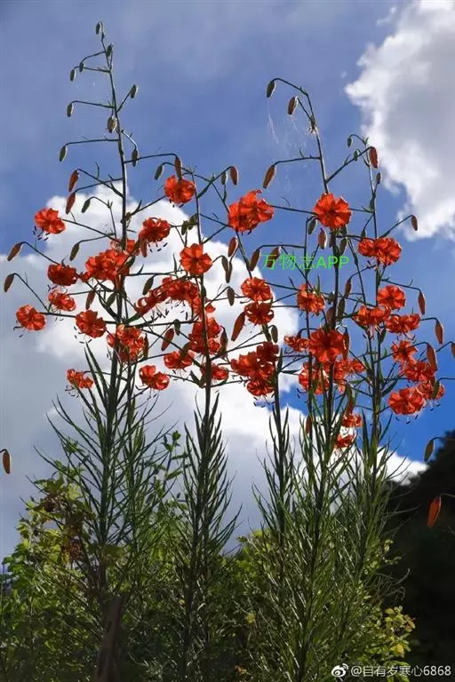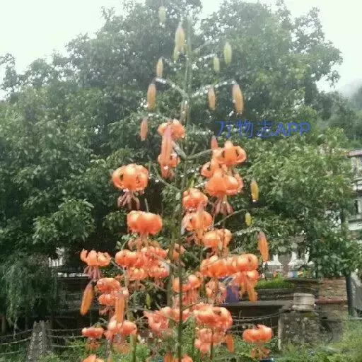 川百合(学名:Lilium davidii Duchartre):鳞茎为扁球形,白色。茎干绿色,上半部有小突起及稀疏的绵毛。叶片散生,为线状披针形, 边缘反卷并有明显的小乳头状突起,中脉明显,往往在上面凹陷,在背面凸出,叶腋有白色绵毛。花下垂,桔红色,花被上有密集的褐色斑点,花被极度反卷,背部疏生白绵毛。花期在7月份,果期在9月份。
