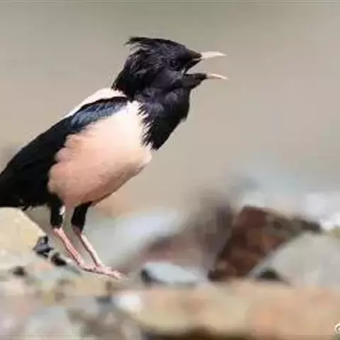 粉红椋鸟:中等体型,成鸟体长19-22厘米,体重60-73克,飞羽、尾羽为亮黑色,雌鸟与雄鸟毛色相似,…