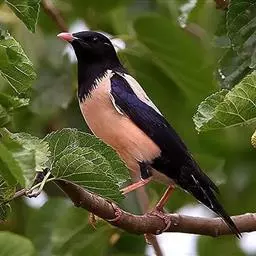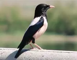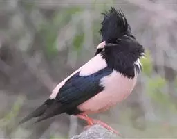 粉红椋鸟是雀形目椋鸟科粉红椋鸟属鸟类。头顶具紫色羽冠;头部、颈、颏、喉黑色具蓝紫色金属光泽;背和腹粉红色;两翅和尾黑褐色;虹膜暗褐色;嘴黄色或粉红色,上嘴基部黑色,冬季嘴为褐色;脚黄色。嘴较其他椋鸟短而钝,上嘴弯曲较明显;脚较粗壮,爪发达。粉红椋鸟分布于欧洲东南部、西伯利亚、西亚、印度和斯里兰卡岛等地区,在中国新疆西部和北部、西藏西部、澳门、台湾等地也能看到其身影。栖息于干旱平原、荒漠或半荒漠地区。常成群活动,鸣声嘈杂。主要在地面觅食,以甲虫、蝗虫、毛虫等各种昆虫为食,偶食植物果实和种子。繁殖期5—7月,营巢于岩壁缝隙、树洞中,每窝产卵4—6枚,卵白色或淡蓝色,孵化期13—15天。雏鸟晚成性,由雌雄亲鸟共同喂养。粉红椋鸟种群数量较少,已被列入中国国家林业局2000年8月1日发布的《国家保护的有益的或者有重要经济、科学研究价值的陆生野生动物名录》。