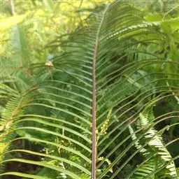 苏铁蕨 土生,大型草本。 植株高达1.5米。主轴直立或斜上,粗约10-15厘米,单一或有时分叉,黑褐色,木质,坚实,顶部与叶柄基部均密被鳞片;鳞片线形,长达3厘米,先端钻状渐尖,边缘略具缘毛,红棕色或褐棕色,有光泽,膜质。
