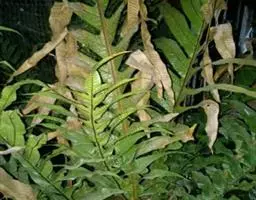 叶簇生于主轴的顶部,略呈二形;叶柄长10-30厘米,粗3-6毫米,棕禾秆色,坚硬,光滑或下部略显粗糙;叶片椭圆披针形,长50-100厘米,一回羽状;羽片30-50对,对生或互生,线状披针形至狭披针形,先端长渐尖,基部为不对称的心脏形,近无柄,边缘有细密的锯齿,偶有少数不整齐的裂片,干后软骨质的边缘向内反卷,下部羽片略缩短,彼此相距2-5厘米,平展或向下反折,羽片基部略覆盖叶轴,向上的羽片密接或略疏离,斜展,中部羽片最长,达15厘米,宽7-11毫米,羽片基部紧靠叶轴;能育叶与不育叶同形,仅羽片较短较狭,彼此较疏离,边缘有时呈不规则的浅裂。