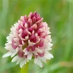 头状花序着生顶端和上部叶腋,具花20-35朵;总花梗长1.3 (-5) 厘米,被柔毛;花序下端具1早落的膜质总苞;花长 (10) 12-17毫米,萼钟形,长6-10毫米,被长柔毛,脉纹10条,萼齿丝状锥尖,比萼筒长2倍;花冠淡红色至紫红色,旗瓣椭圆形,先端钝圆,基部稍窄,几无瓣柄,翼瓣长圆形,下方有一钩状耳,龙骨瓣长圆形,比翼瓣短,先端具小尖喙,基部具长瓣柄;子房狭椭圆形,无毛,具柄,花柱丝状,上部弯成钩状;胚珠5-8粒。