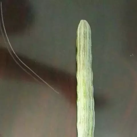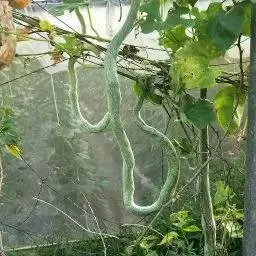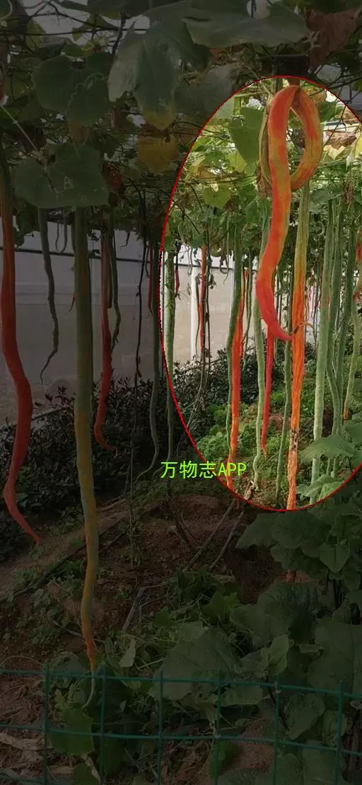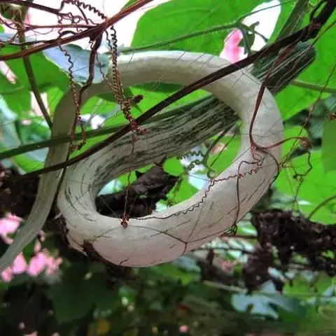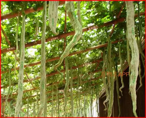 蛇瓜自瓜柄开始有数条绿色线纹,瓜体有的垂直,有的弓身,有的弯曲,有的卷尾,酷似—条条长蛇在棚架下展姿。在嫩瓜期,瓜体表面有白绿色相间的条纹似白花蛇,老熟后的瓜体表面又呈现红绿色相间的条纹似红花蛇,体态各异,栩栩如生,稀奇而美观。