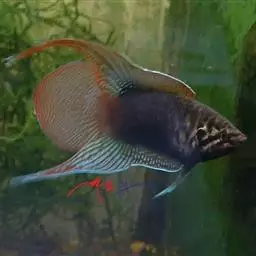 叉尾斗鱼,体形与圆尾斗鱼相似。腹鳍有1根分节鳍条特别延长,雄鱼鳍条延长尤甚,尾鳍叉形。…