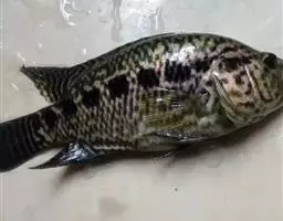 本种鱼为口孵鱼类。因此繁殖很简单。亲鱼性成熟年龄为6个月,雄鱼有婚姻色,体色变成棕黑色,或深黑色背鳍黄色,体侧黑带泛有浅蓝色;雌鱼腹部膨大,体色略淡。繁殖水温27~29℃,水质弱碱性或中性,可选用50×30×35厘米或者更大的鱼缸,将亲鱼放入。雌鱼产卵后,将卵含在自己口中,然后受雄鱼臀鳍上的伪卵吸引,嘴巴靠近雄鱼的臀鳍,雄鱼释放精液从而使雌鱼口中的卵受精。卵经约三天孵出仔鱼,在孵化期间,雌鱼不能喂食,以便它不断地鼓动双鳃,以增加口中氧气。当仔鱼游水后,若有险情,雌鱼立刻将仔鱼含入口中游离。1~2周后仔鱼长大,这时可将雌鱼捞出。雌鱼每次产卵30~60粒。如需要人工干预鱼卵孵化,请在雌鱼含卵五天后将鱼卵抠出,放置在事先准备好的孵化器皿内。幼鱼在卵黄吸收完毕后开口,开口饲料以刚孵化的丰年虾为最佳。如无,请用洄水或研磨碎的颗粒饲料以及丰年虾脱壳卵代替。