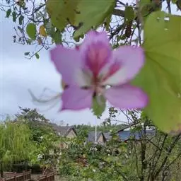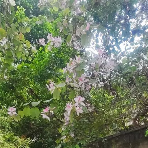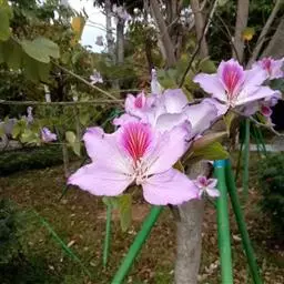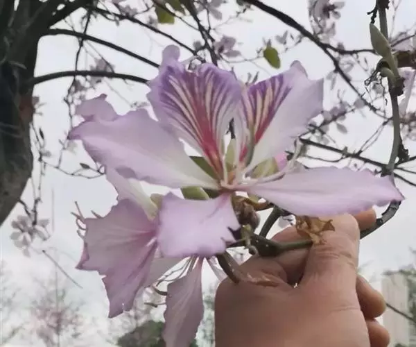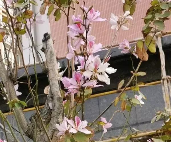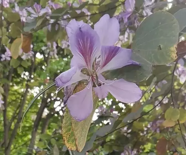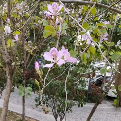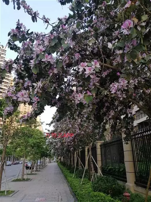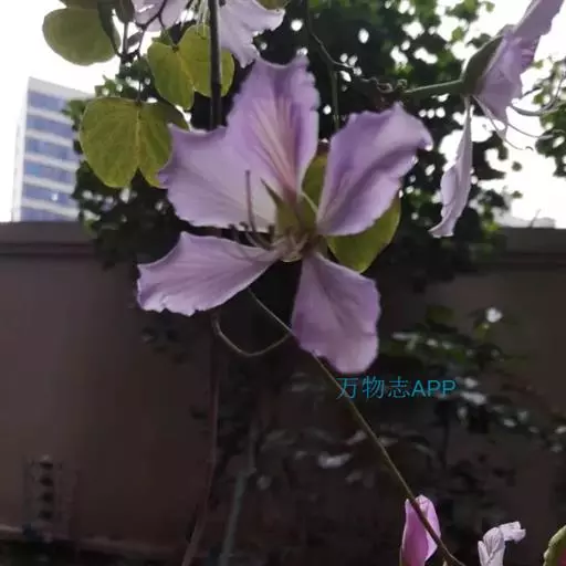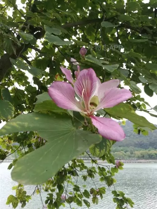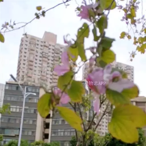 洋紫荆(学名:Bauhinia variegata L.):落叶乔木;树皮暗褐色,近光滑;幼嫩部分常被灰色短柔毛;枝广展,硬而稍呈之字曲折,无毛。叶近革质,广卵形至近圆形,宽度常超过于长度,先端2裂达叶长的1/3,裂片阔,钝头或圆,两面无毛或下面略被灰色短柔毛。总状花序侧生或顶生,极短缩,多少呈伞房花序式,少花,被灰色短柔毛;花大,近无梗;花蕾纺锤形;萼佛焰苞状,被短柔毛;花瓣倒卵形或倒披针形,长4-5厘米,具瓣柄,紫红色或淡红色,杂以黄绿色及暗紫色的斑纹。荚果带状,扁平;种子10-15颗,近圆形,扁平,直径约1厘米。花期全年,3月最盛。