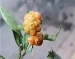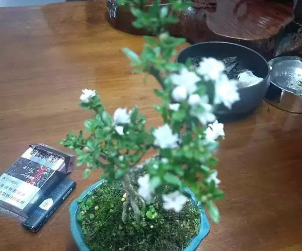 栀子花,花朵簇状约30枚瓣,奶油色,中心黄色;花径12cm;气味果香.