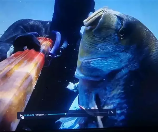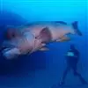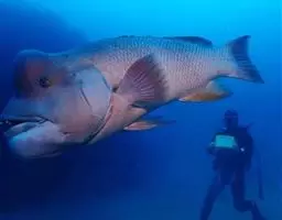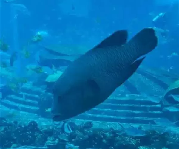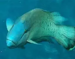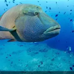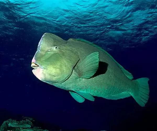波纹唇鱼(学名:Cheilinus undulatus):体延长而呈长卵圆形;头部轮廓自背部至眼平直,然后凸出;成鱼前额突出口端位,中大;上下颌各具锥形齿一列,前端各有一对大犬齿;前鳃盖骨边缘具锯齿,左右鳃膜愈合,不与峡部相逢体被大形圆鳞。成鱼背鳍与臀鳍后部延长,达尾鳍基部;尾鳍圆形;老成鱼腹鳍可达肛门之后。幼鱼体浅绿色,每一鳞片具黑纹;眼后具2条黑纹。成鱼体绿色,体侧每一鳞片具黄绿色及灰绿色横线;头具橙色与绿色的网状细线;奇鳍密部细斜线;尾鳍后缘黄色。主要栖息于很陡的礁岩斜坡,海流道斜坡和泻湖的礁岩上,深度从2-60米左右。通常单独出现,偶尔会成对出现。是隆头鱼科中的大型种,个性温和,容易与人亲近。肉食性,以鱼类及底栖性动物为主要食物。波纹唇鱼是一种热带地区近海海域生存的著名巨型鱼类。分布于大洋洲、太平洋西部热带海域、大堡礁、印度洋西北部及红海。其体型巨大味道鲜美,被作为名贵食用鱼,在海洋馆或大型展示鱼缸中亦可作为观赏鱼。