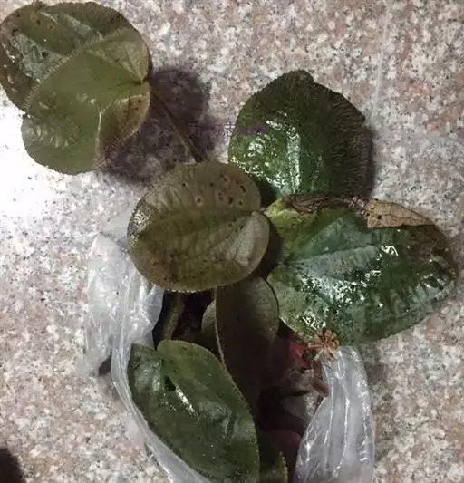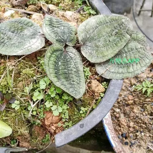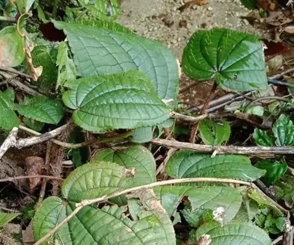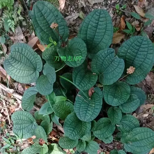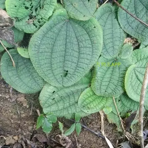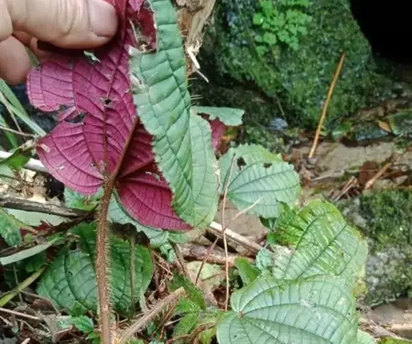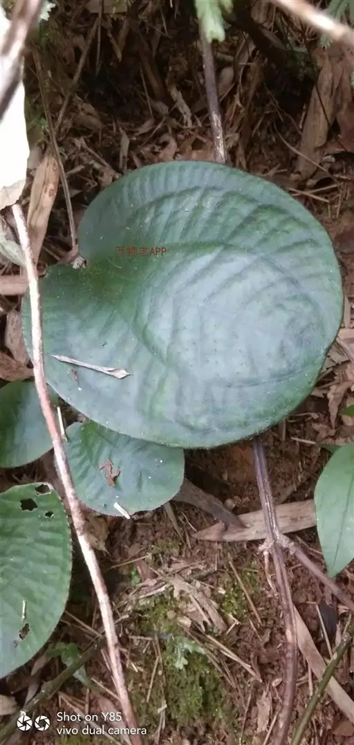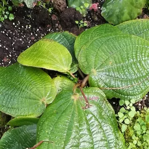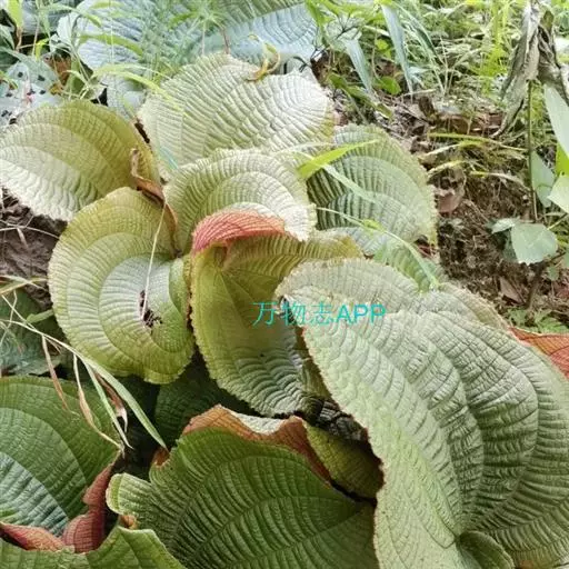 草本,茎极短,被红色粗硬毛,具粗短的根状茎,长约6厘米,略木质化。叶基生,叶片膜质,心形,顶端近圆形,基部心形,长宽20-30厘米或更大,边缘具不整齐的啮蚀状细齿,具缘毛,基出脉9,叶面无毛,基出脉平整,侧脉及细脉微隆起,背面密被糠秕,脉均隆起,明显,被红色长柔毛及微柔毛;叶柄圆柱形,肉质,长10-17厘米或更长,被红色粗硬毛,具槽。
