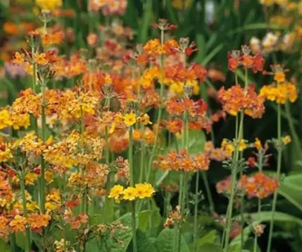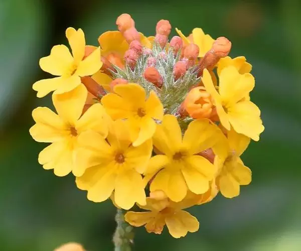 花葶粗壮,高20-70厘米,节上和顶端被乳黄色粉,具伞形花序5-7轮,每轮具(4)8-16花;苞片线形,通常稍长于花梗;花梗长1.3-2.5厘米 ,微被粉;花萼钟状,长5-9.5毫米,分裂达中部或略过之,裂片披针形,先端渐尖成钻状,外面微被粉,内面密被乳黄色粉;花未开放时呈深橙红色,开后为深橙黄色,冠檐直径达2厘米,裂片长圆伏倒卵形,先端微凹,长花柱花:冠筒长10-12毫米,雄蕊着生处距冠筒基部约5毫米,花柱长约8.5毫米;短花柱花:花冠筒长14-15毫米,雄蕊距冠筒基部约10毫米着生,花柱长约5毫米。蒴果近球形,约与花萼等长。花期6-7月。