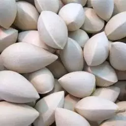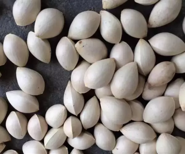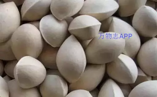 椭圆形移动图册,长1.5~2.5cm,宽1~2cm,厚约1cm。表面黄白色或淡黄棕色,平滑坚硬,一端稍尖,另端钝,边缘有2~3条棱线,中种皮(壳)质硬。内种皮膜质。一端淡棕色,另端金黄色。种仁粉性,中间具小芯。味甘、微苦。