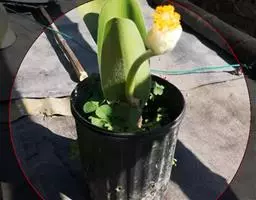 4、药辅并用,促莛催花:可将市场上购买的君子兰促箭剂按说明书涂抹在花莛上或滴于盆土中;也可用人工方法将夹箭处两侧的叶片撑开,但不能损伤叶片,以减少叶片对花莛的夹力,促使花莛尽快伸出长高。
