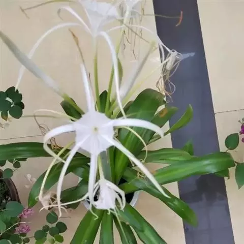 花葶自叶腋中抽出,若从种子开始养护,一般要达到15片叶时开花。花茎宽约2厘米;小花有柄,在花顶端呈伞形排列,花漏斗状,直立,黄或橘黄色、橙红色。伞形花序顶生,花直立,有数枚覆瓦状排列的苞片,每个花序有小花7-30朵,多的可达40朵以上。花被裂片6,合生。垂笑君子兰则花稍垂,花被狭漏斗状。 花梗长2.5-5厘米;花直立向上,花被宽漏斗形,鲜红色,内面略带黄色;花被管长约5毫米,外轮花被裂片顶端有微凸头,内轮顶端微凹,略长于雄蕊;花柱长,稍伸出于花被外。