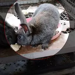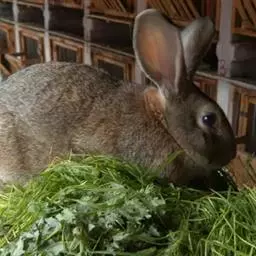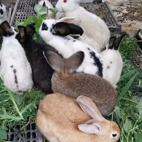 野兔以野草、树叶等植物为食,人工养殖饲料来源广泛、各种牧草、青菜、秸秆等均可喂养,一般早、中餐喂青饲料和多汁饲料,晚上喂青饲料和少量颗粒饲料。
