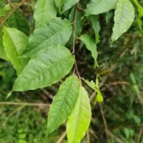 叶片长圆披针形、椭圆披针形或倒卵状披针形,长7-15厘米,宽2-3.5厘米,先端渐尖,基部宽楔形,上面无毛,下面在脉腋间具少数短柔毛或无毛,叶边具细锯齿或粗锯齿,齿端具腺体或无腺体;叶柄粗壮,长1-2厘米,常具1至数枚腺体,有时无腺体。