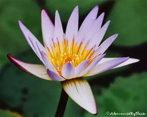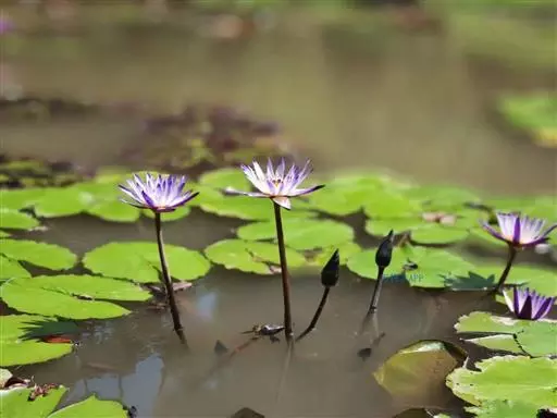 延药睡莲(学名:Nymphaea stellata Willd. ):是多年生水生草本;根状茎肥厚。叶二型:浮水叶圆形或卵形,基部具弯缺,心形或箭形,常无出水叶;沉水叶薄膜质,脆弱。花形美丽,浮在或高出水面;萼片4,近离生;花瓣成多轮,心皮环状,贴生且半沉没在肉质杯状花托,且在下部与其部分地愈合,上部延伸成花柱,柱头成凹入柱头盘,胚珠倒生,垂生在子房内壁。浆果海绵质,不规则开裂,在水面下成熟;种子坚硬,为胶质物包裹。栽培供观赏。