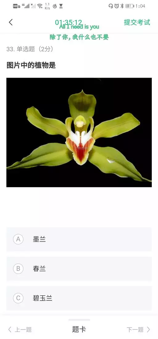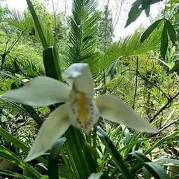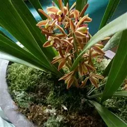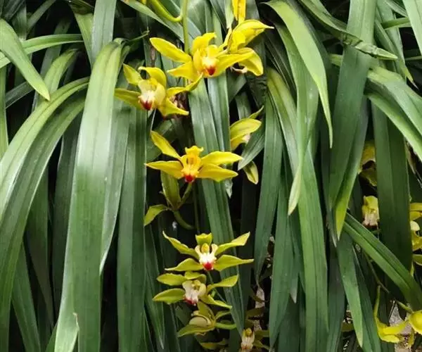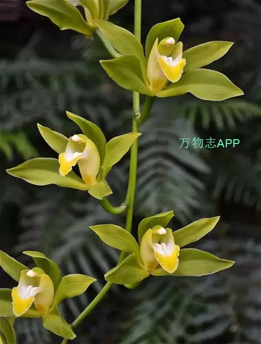 碧玉兰(学名:Cymbidium lowianum (Rchb. f.) Rchb. f.):附生植物;假鳞茎狭椭圆形,略压扁,长6-13厘米,宽2-5厘米,包藏于叶基之内。叶5-7枚,带形,长65-80厘米,宽2-3.6厘米。花葶从假鳞茎基部穿鞘而出,近直立;总状花序具10-20朵或更多的花;萼片和花瓣苹果绿色或黄绿色,有红褐色纵脉,唇瓣淡黄色;花瓣狭倒卵状长圆形。花期4-5月。
