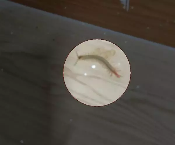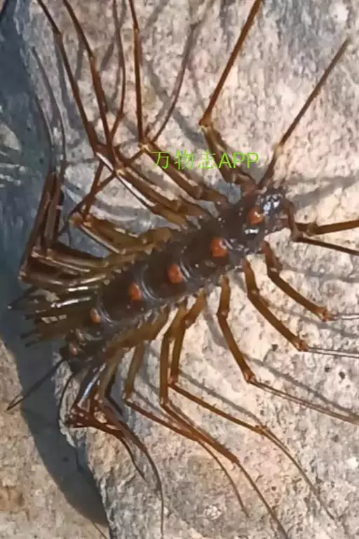 外形结构特点:呈灰白色,虫体呈节状,约10~15 节,每节有细长足1对,最后一对较长,背部从头至尾有1条线状黑斑,腹部灰白色,头尾各1对触须,两侧有1对黑色眼点,毒颚较大,末端有毒爪,与体内的毒腺相通。