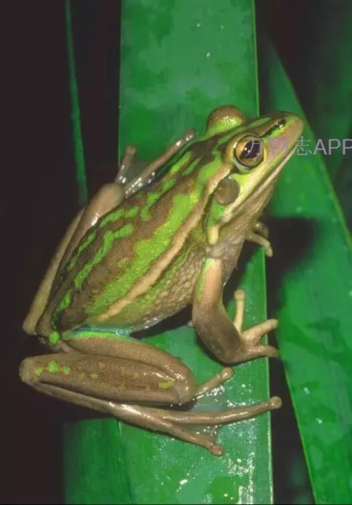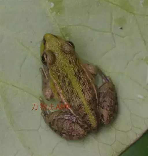 金线蛙 金线蛙体型肥硕,成年体长约50毫米(雄体略小),头长约等于头宽,吻端钝圆。鼓膜大而明显棕黄色,颞褶不显著。背部绿色杂有一些黑色斑点,有两长条褐色斑,从吻端一直延伸到泄殖腔口,形成明显的绿色的背中线。体侧绿色有些黑斑,两侧各有一条粗大的褐色、白色或浅绿色的背侧褶。皮肤光滑,但在背部及体侧有些疣粒。腹部光滑,黄白色带有一些棕色点。前肢指细长无蹼。后肢粗短有黑色横带,趾间蹼发达为全蹼。股部内侧黑色有许多小白斑。雌蛙体型比雄蛙大很多。雄蛙有一对咽侧内鸣囊,第一指有婚埝。