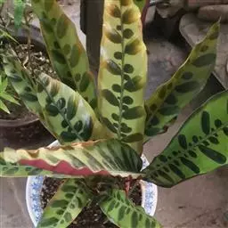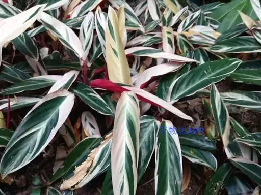 根出叶,叶长椭圆状披针形,全缘,叶面深绿色,具有淡绿、白至淡粉红色羽状斑彩,叶柄及叶背暗红色。叶长椭圆形,叶缘稍有波浪形起伏状,叶面七彩斑斓。