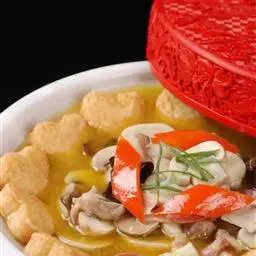 3、烧热 砂窝下油1汤匙,放入豆腐,再加入冬菇片、珍珠笋、红萝卜花、菜心,再注入上汤,慢火煮至汁液浓稠,打献汁(埋芡),即可上桌。要趁热进食。
