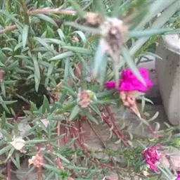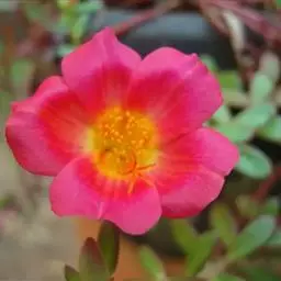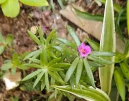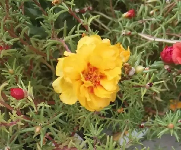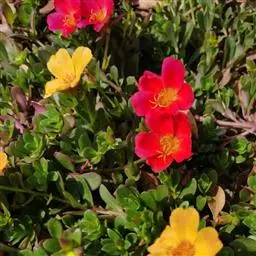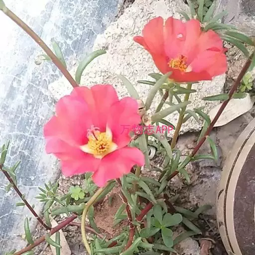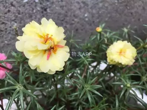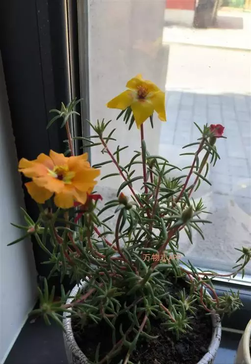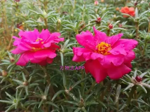 大花马齿苋(学名:Portulaca grandiflora Hook.):一年生草本,高10-30厘米。茎平卧或斜升,紫红色,多分枝,节上丛生毛。叶密集枝端,较下的叶分开,不规则互生,叶片细圆柱形,无毛。花单生或数朵簇生枝端,直径2.5-4厘米,日开夜闭;总苞8-9片,叶状,轮生,具白色长柔毛;花瓣5或重瓣,倒卵形,顶端微凹,长12-30毫米,红色、紫色或黄白色。蒴果近椭圆形,盖裂;种子细小,多数,圆肾形,直径不及1毫米。花期6-9月,果期8-11月。