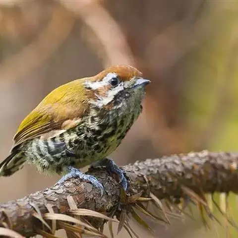 竹啄木鸟(学名:Gecinulus grantia),是啄木鸟科、竹啄木鸟属的小型鸟类,体长23-25厘米。嘴蓝白色或淡蓝色,头顶至枕玫瑰色而缀有橙色或全为红色。额、眼先、颊淡皮黄色或黄白色,后颈和颈侧橄榄黄色,上体栗红色,下体橄榄褐色。翅黑褐色,具棕黄色或白色斑点,腰和尾上覆羽具暗红色羽缘,尾暗褐色,具浅色横斑和栗红色羽缘。雌鸟头顶黄绿色而无红色,其余似雄鸟。