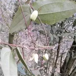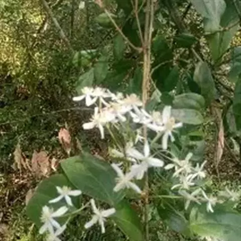 大花威灵仙 2011年5月摄于浙江西部山区 ,本质藤本,长2-4m。须根黄褐色,新鲁时微辣。茎圆柱形,棕红色或深棕色,幼时被开展的柔毛,后脱落近无毛。叶对生,三出复叶或二回二出复叶;叶柄长6-11cm,基部微膨大;小叶片薄纸质或亚革质,长圆形或卵状披我形,长5-7cm,宽2-3.5cm,先端渐尖,基部阔楔形,全缘,上面主脉被短柔毛,下面被柔毛;小叶柄短或长1-2cm,被柔毛。