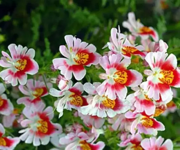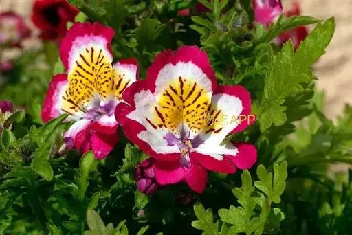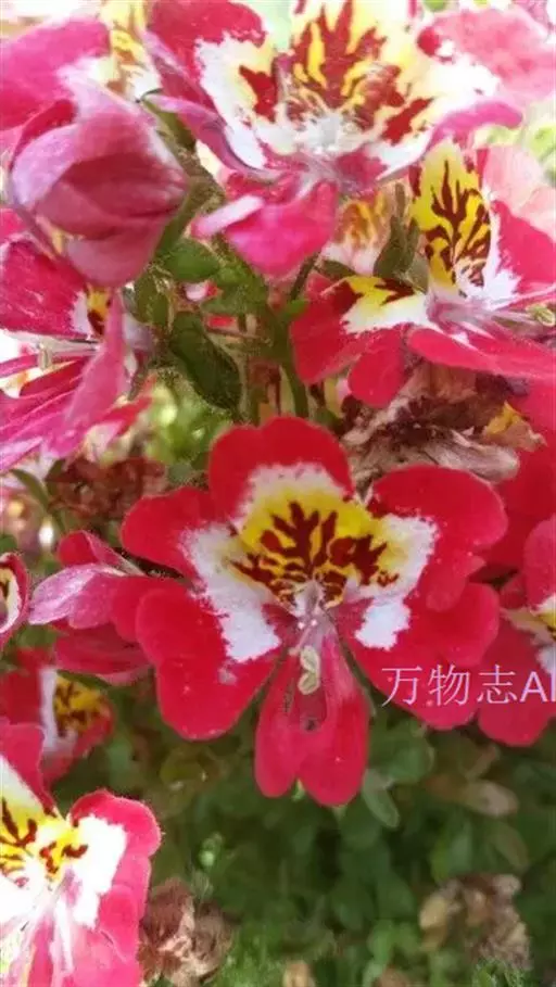 圆锥花序顶生。花多数,花冠3-4厘米,花瓣5片,平展,其中3片花瓣的基部为红色、紫色、堇色,白色,其上镶嵌着红色或紫色的脉纹或斑点,花瓣外沿有红色,艳粉、淡紫、白色等,另有3片花瓣呈盔状,有深裂,一朵花上多种颜色,十分艳丽,花后结籽,蒴果2裂,种小肾形。8-9月份播种,次年春季开花;早春播种,夏季开花。 [2-3]
