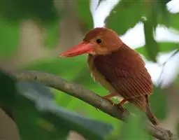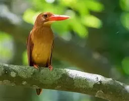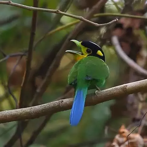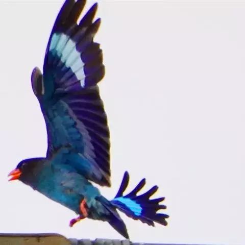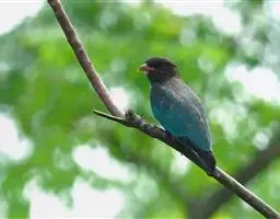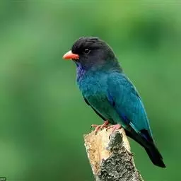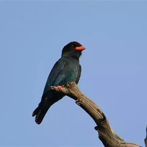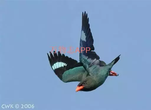 三宝鸟(学名:Eurystomus orientalis)为佛法僧目三宝鸟属下的一种中小型攀禽,共有10个亚种,体长26-29厘米,体重107-194克。通体蓝绿色,头和翅较暗,呈黑褐色,初级飞羽基部具淡蓝色斑,飞翔时甚明显。虹膜暗褐色,嘴、脚红色。常长时间地站在林缘路边高大乔木顶端枯枝上,或在空中成圈飞翔和上下飞翔,边飞边“嘎嘎”地鸣叫。 如发现飞行中昆虫,则追赶捕食,如果在地上发现蜥蝪或昆虫,则如伯劳采饵,在地上以跳跃代步行捕食。