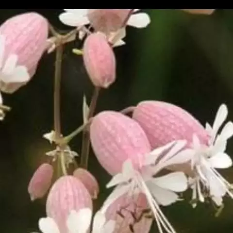 单歧式聚伞花序;花梗细,直立,长5-15毫米,果时反折;苞片披针形,草质;花萼倒卵形,长13-15毫米,直径约5毫米,被短柔毛,纵脉微凸起,带紫色,沿脉被腺柔毛,脉间宽,膜质,萼齿短,三角形,顶端钝,边缘膜质;雌雄蕊柄无毛,长3-5毫米;花瓣淡红色至白色,爪狭楔形,无毛,瓣片轮廓倒心形,长7-10毫米;副花冠片长圆形,顶端钝;雄蕊微外露;花柱明显外露。蒴果卵状锥形,长约9毫米,比宿存萼短;种子圆肾形,长约1毫米。花期5-6月,果期6-7月。