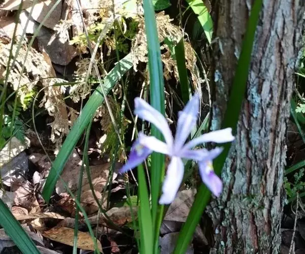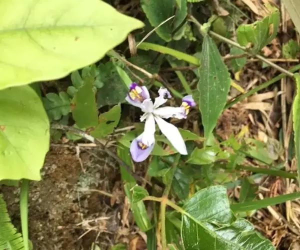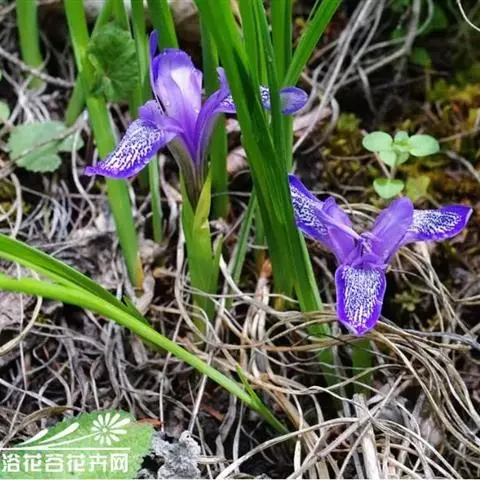 小花鸢尾(学名:Iris speculatrix Hance):多年生草本,植株基部围有棕褐色的老叶叶鞘纤维及披针形的鞘状叶。根状茎二歧状分枝,斜伸,棕褐色;根较粗壮,少分枝。叶略弯曲,暗绿色,有光泽,剑形或条形,有3-5条纵脉。花茎光滑,不分枝或偶有侧枝,有1-2枚茎生叶;苞片2-3枚,草质,绿色,狭披针形,内包含有1-2朵花;外花被裂片匙形,有深紫色的环形斑纹,内花被裂片狭倒披针形,直立。蒴果椭圆形,顶端有细长而尖的喙;种子为多面体,棕褐色,旁附有小翅。花期5月,果期7-8月。