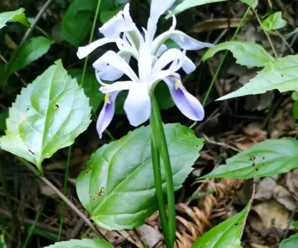 花茎光滑,不分枝或偶有侧枝,高20-25厘米,有1-2枚茎生叶;苞片2-3枚,草质,绿色,狭披针形,长5.5-7.5厘米,顶端长渐尖,内包含有1-2朵花;花梗长3-5.5厘米,花凋谢后弯曲;花蓝紫色或淡蓝色,直径5.6-6厘米;花被管短而粗,长约5毫米,外花被裂片匙形,长约3.5厘米,宽约9毫米,有深紫色的环形斑纹,中脉上有鲜黄色的鸡冠状附属物,附属物表面平坦,似毡绒状,内花被裂片狭倒披针形,长约3.7厘米,宽约9毫米,直立;雄蕊长约1.2厘米,花药白色,较花丝长;花柱分枝扁平,长约2.5厘米,宽约7毫米,与花被裂片同色,顶端裂片细长,狭三角形,子房纺锤形,绿色,长1.6-2厘米,直径约5毫米。