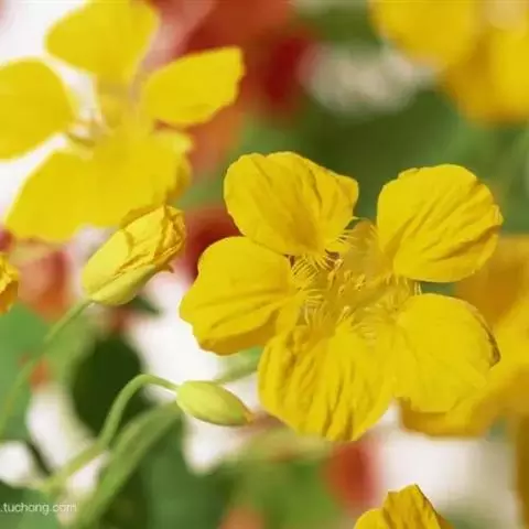 金莲花常用播种繁殖,也可用嫩枝扦插。一般于3月播种,7月至8月开花;6月播种,国庆节开花;9月播种,春节开花;12月播种,“五一”开花。播种先用40℃至45℃温水浸泡一夜后,将其点播在装有素沙的浅盆中,上覆细沙厚约1厘米,播后放在向阳处保持湿润,10天左右出苗,幼苗2片真叶时分栽上盆。扦插以春季室温13℃至16℃时进行,剪取有3片至4片叶的茎蔓,长10厘米,留顶端叶片,插入沙中,保持湿润,10天开始发根,20天后便可上盆。金莲花茎蔓生,必须立支架,当幼苗长到3片至4片真叶时进行摘心,使其多发侧枝,上架前除留主枝及粗壮侧枝外,还需摘心并均匀地绑缚在架上,扎成各种装饰形式。当茎蔓生长达30厘米至40厘米时,可用 100毫克/升多效唑叶面喷布,促使矮化。花后把老枝剪去,待发出新枝开花。对已经衰老的植株,当气温达10℃以上时,可在基部剪去上部枝叶,施入20%腐熟的人粪肥,放入7℃左右的温室内,促使重新发枝,形成新株丛。 金莲花栽培宜选用富含有机质的沙壤土 ,PH值 5至6。一般在生长期每隔3周至4周施一次10%至15%饼肥水,开花前改用半月施1次至2次鸡粪液肥或1%磷酸二氢钾,花后施25%饼肥水或者20%畜粪肥,秋末施一次30%全元素复合肥作越冬肥,每次施肥后要及时松土,改善通气性,以利根系发育。金莲花喜湿忌涝,土壤水分保持50%左右,生长期间浇水要采取小水勤浇的办法,春秋季节 2天至3天浇一次水,夏天每天浇一次水,并在傍晚往叶面上喷水一次,以保持较高的湿度,开花后减少浇水,防止枝条旺长。金莲花喜阳光充足,不耐荫蔽,春秋季节应放在阳光充足处培养,夏季适当遮阴,盛夏放在凉爽通风处,北方10月中旬入室,南方11月上旬入室,放在向阳处养护,室温保持10℃至15℃,适当控制肥水。另外生长过程中如发生蚜虫和白粉虱,要用吡虫灵、扑虱灵、敌杀死等无公害农药及时防治。