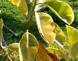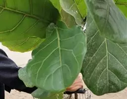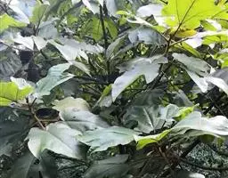 常绿乔木,高10-20米,胸径达30-50厘米;老树常有板状根;树皮厚,黑褐色;小枝粗2-6毫米,具纵绉纹至平滑,无毛;托叶抱茎环状,遗痕明显。叶革质,螺旋状排列,椭圆形或倒卵形,长7-15厘米或更长,宽3-7厘米,先端钝或渐尖,基部楔形,成熟之叶全缘,或在幼树和萌发枝上的叶常分裂,表面墨绿色,干后浅绿或淡褐色,无毛,有光泽,背面浅绿色,略粗糙,叶肉细胞具长臂,组织中有球形或椭圆形树脂细胞,侧脉羽状,每边6-8条,中脉在背面显著凸起;叶柄长1-3厘米;托叶抱茎,卵形,长1.5-8厘米,外面被贴伏柔毛或无毛,脱落。