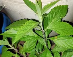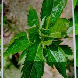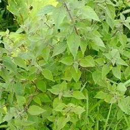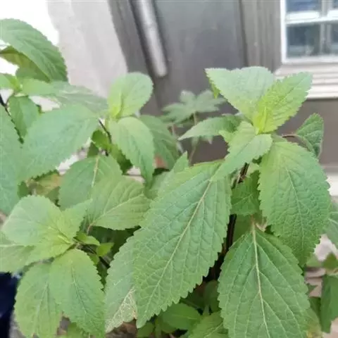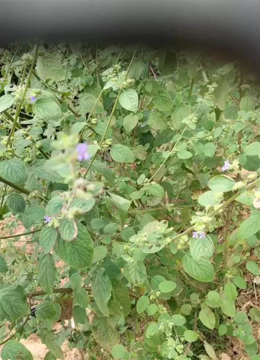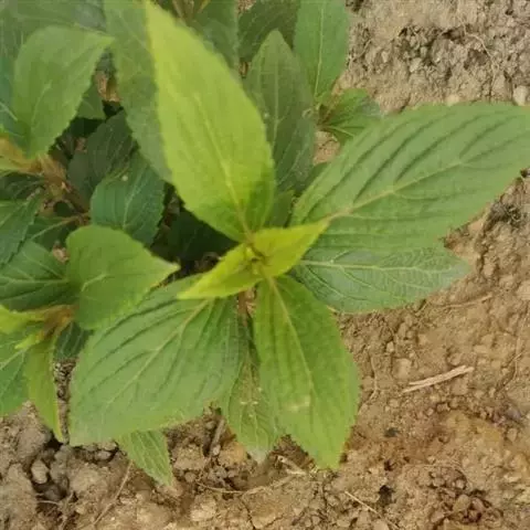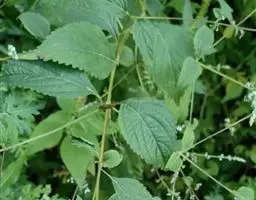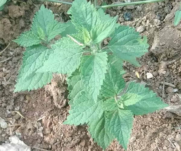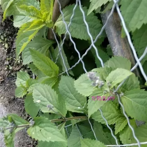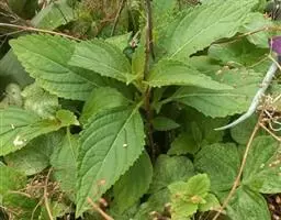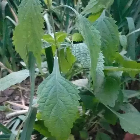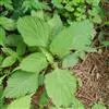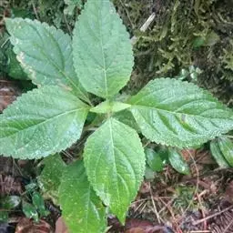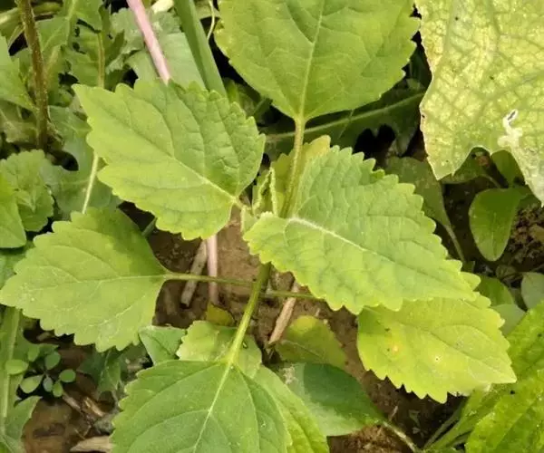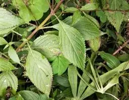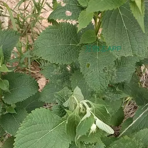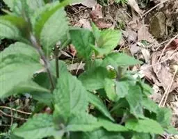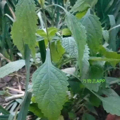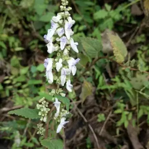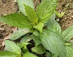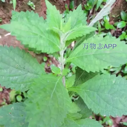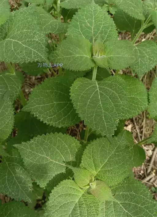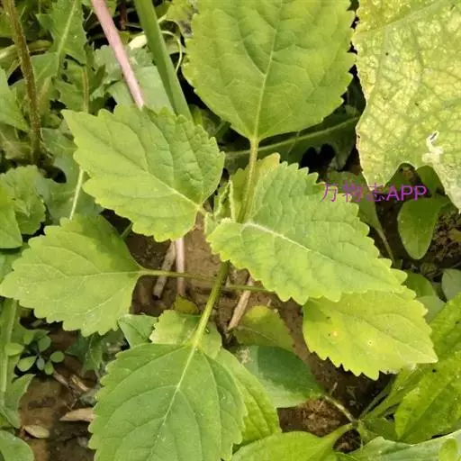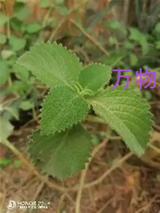 茎呈方柱形,上部多分枝,长20-50cm,直径约2mm;表面灰绿色或灰棕色,四面凹下成纵沟,密被倒向的柔毛;质脆易折断,断面木部窄,黄棕色,髓部大,白色。叶对生,灰绿色,多皱缩,破碎,完整叶片展平后呈卵形,卵状披针形,长3-7cm,宽1.5-4cm,边缘具粗锯齿,先端渐尖,基部楔形,两面有柔毛;叶柄长0.2-2.5cm。气微,味苦。