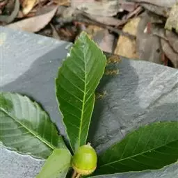 坚果卵形至卵圆形,直径0.8-1.2厘米,高1.7-2厘米,果脐平坦。花期3-4月,果期9-10月。