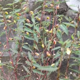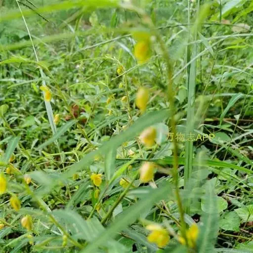一年生草本,株高30-60厘米,稍有毛,分枝或不分枝。叶长4-8厘米,有小叶8-28对,在叶柄的上端有黑褐色、盘状、无柄腺体1枚,;小叶长5-9毫米,带状披针形,稍不对称。花生于叶腋,有柄,单生或2至数朵组成短的总状花序;萼片5,分离,外面疏被柔毛;花瓣5,黄色;雄蕊4枚,有时5枚;子房密被短柔毛。荚果扁平,有毛,开裂,长3-8厘米,宽约5毫米,有种子6-12粒;种子扁,近菱形,平滑。