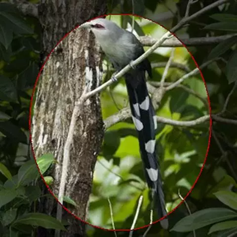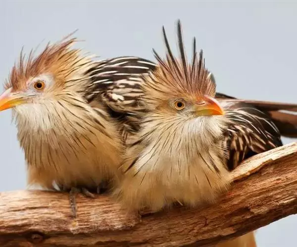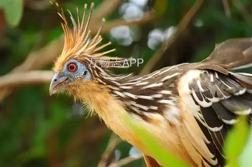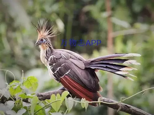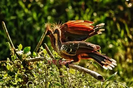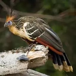 麝雉(学名:Opisthocomus hoazin):体长约65厘米,体重不及1 千克。雌雄相似,头上有由长短不一的羽毛组成的羽冠,身体背部有带白色条纹的棕色羽毛,尾羽和靠近尾部的后腹部羽毛是土红色的,而前胸则是奶黄色的。它的脸呈天蓝色。麝雉嗉囊极大,分为两部分,用于贮存和消化海芋属植物有弹性的叶子,那是它主要的食物来源。由于麝雉身体里散发出一种浓烈的霉味,因此才称作麝雉(Stinkbird)。