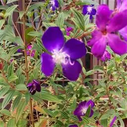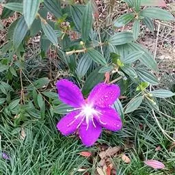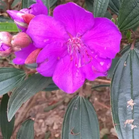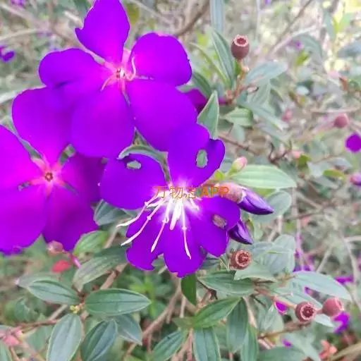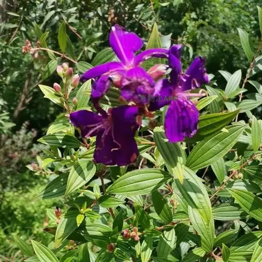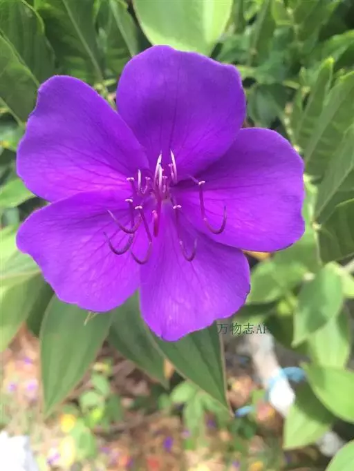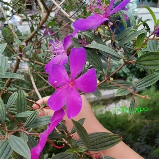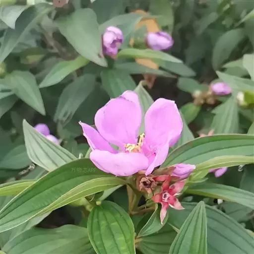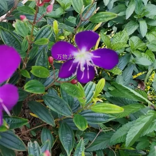 野牡丹(学名:Melastoma candidum D. Don):灌木,高0.5-1.5米,分枝多;茎钝四棱形或近圆柱形,毛扁平边缘流苏状。叶片坚纸质,卵形或广卵形,全缘,7基出脉,两面被糙伏毛及短柔毛。伞房花序生于分枝顶端,近头状,有花3-5朵;花瓣玫瑰红色或粉红色,倒卵形,长3-4厘米,顶端圆形,密被缘毛。蒴果坛状球形,与宿存萼贴生,长1-1.5厘米,直径8-12毫米,密被鳞片状糙伏毛;种子镶于肉质胎座内。花期5-7月,果期10-12月。