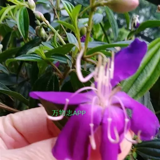 野牡丹是灌木,高0.5-1.5米,分枝多;茎钝四棱形或近圆柱形,密被紧贴的鳞片状糙伏毛,毛扁平边缘流苏状。叶片坚纸质,卵形或广卵形,顶端急尖,基部浅心形或近圆形,长4-10厘米,宽2-6厘米,全缘,7基出脉,两面被糙伏毛及短柔毛,背面基出脉隆起,被鳞片状糙伏毛,侧脉隆起,密被长柔毛;叶柄长5-15毫米,密被鳞片状糙伏毛。