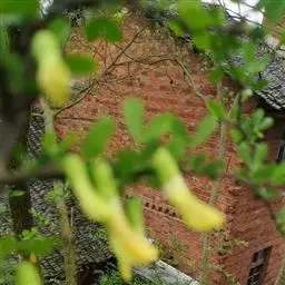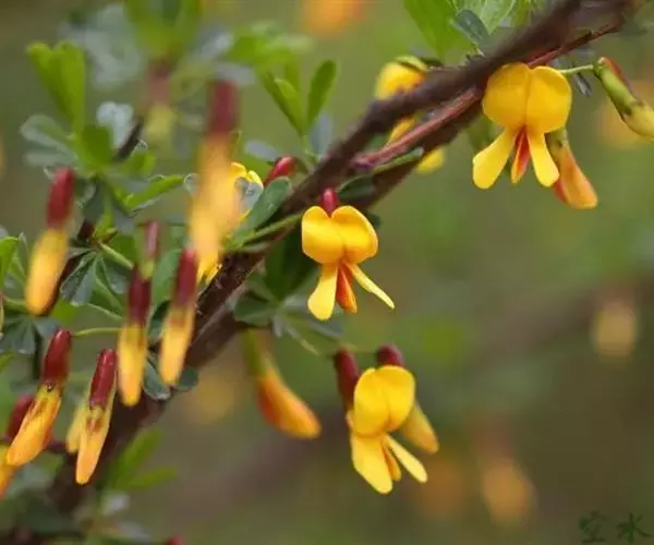 红花锦鸡儿枝繁叶茂,花冠蝶形,黄色带红,形似金雀,花、叶、枝可供观赏,园林中可丛植于草地或配植于坡地,山石旁,或作地被植物。